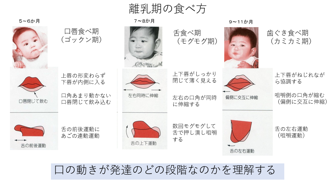 離乳開始時期ではスプーンに乗ったペースト状の食べ物が 口に入ったとき、上唇はほとんど動かないです。これはそれまでのおっぱい飲みの名残があり、なかなか唇 を閉じてゴックンと飲み込むことができないためです。 舌も最初はおっぱいを飲んでいた時と同じようにチューチューと吸うような動きをし、前後的な動きでなんとか食べ ようとします。徐々に「内側にめくり込ませる動き」が見 られるようになり食べ物がこぼれずに上手に飲み込めるようになります。