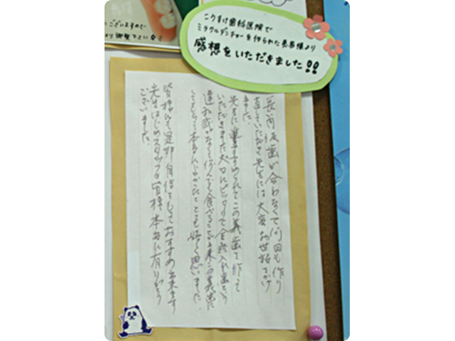 長い間、仮歯が合わなくて何回もつくり直していただき、先生には大変お世話をかけました。先生にすすめられてこの義歯をつくっていただきありがとうございました。処口にピッタリで全然入れ歯という違和感がなくてなんでも食べることができ、この義歯にしてもらって本当によかったと嬉しく思いました。
